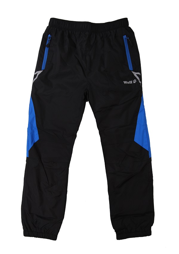 Dětské šust'ákové kalhoty Wolf, velikost 104-140. V pase do gumy+sňůrka na stažení. Na předním díle jsou všité dvě kapsy a reflexní prvky.