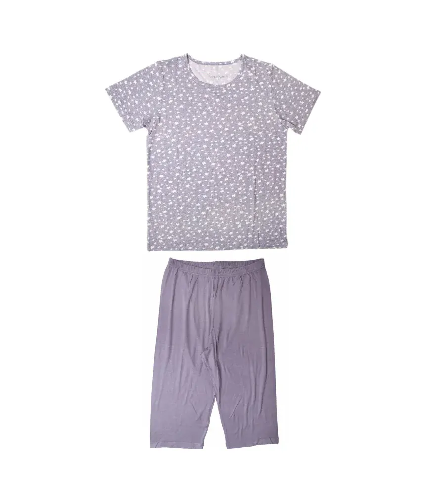 Dámské pyžamo zn. WOLF, velikost S-2XL. Kalhoty 3/4 . pružný materiál barva šedá tričko potisk hvězdičky  Materiál:  95% viskóza, 5% elastan.   Velikost délka zad šířka zad délka nohavice pas S 62cm 46cm 66cm 66-96cm M 66cm 47cm 68cm 68-98cm L 66cm 50cm 70cm 70-100cm XL 70cm 51cm 72c... celý popis